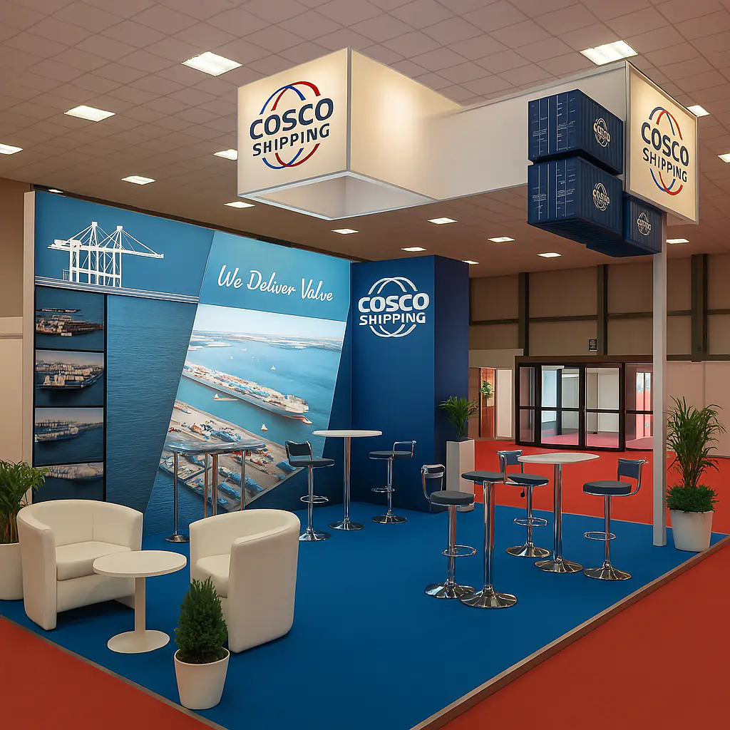 - High-Visibility Branding: We designed a prominent overhead structure featuring the COSCO SHIPPING logo on multiple sides, ensuring maximum visibility from across the exhibition hall. The consistent use of their corporate colors and branding elements reinforced brand recognition.
